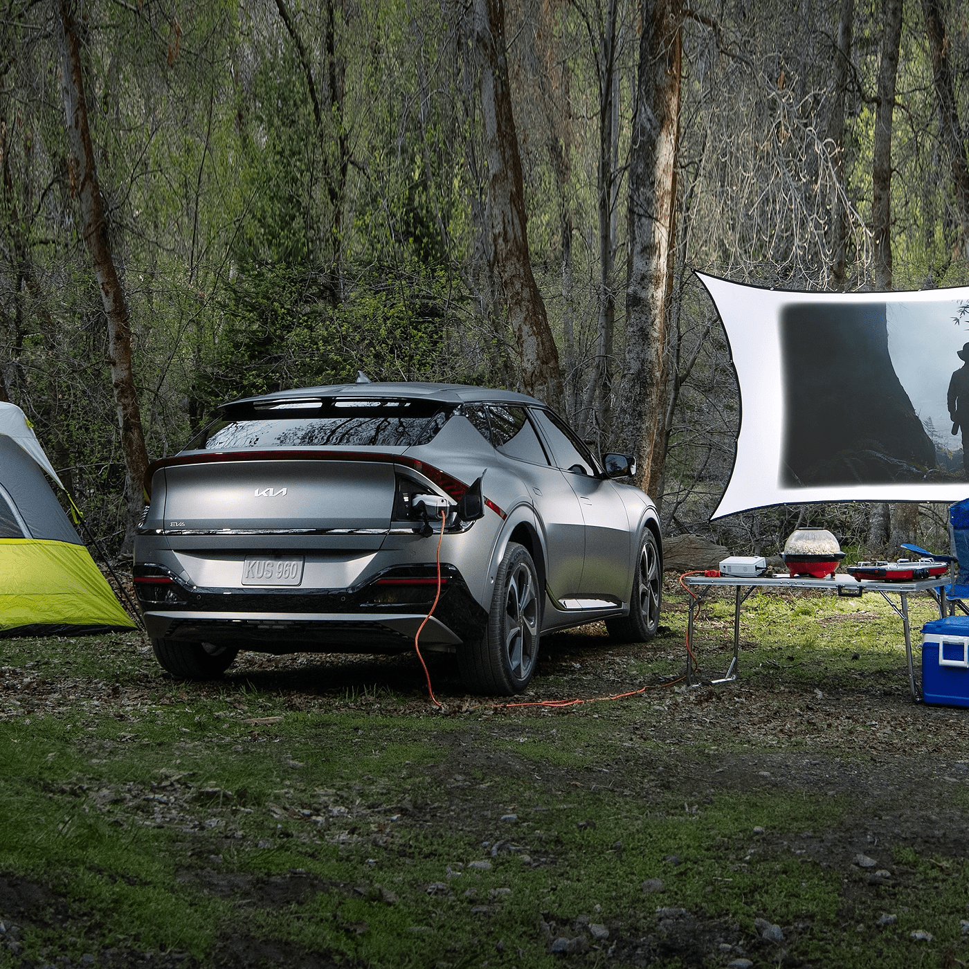Available Vehicle to Load ports allow you to use your EV6 as a charger or to power electric devices, such as mobile phones, laptops, tablets, home appliances, electric bikes, camping equipment, and more. With available e-AWD and a towing capacity of up to 2,000 lbs., you can take your power almost anywhere.